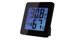 Termometro e igrometro da tavolo con display e cifre di grandi dimensioni. Mostra la temperatura interna in gradi Celsius o Farhenheit, e la percentuale di umidità relativa. Retroilluminazione in blu. Orologio e sveglia con snooze integrati. Memorie max e min per temperatura e umidità. Ingombro complessivo 90x90x30mm. Dimensioni display 65 x 60mm.